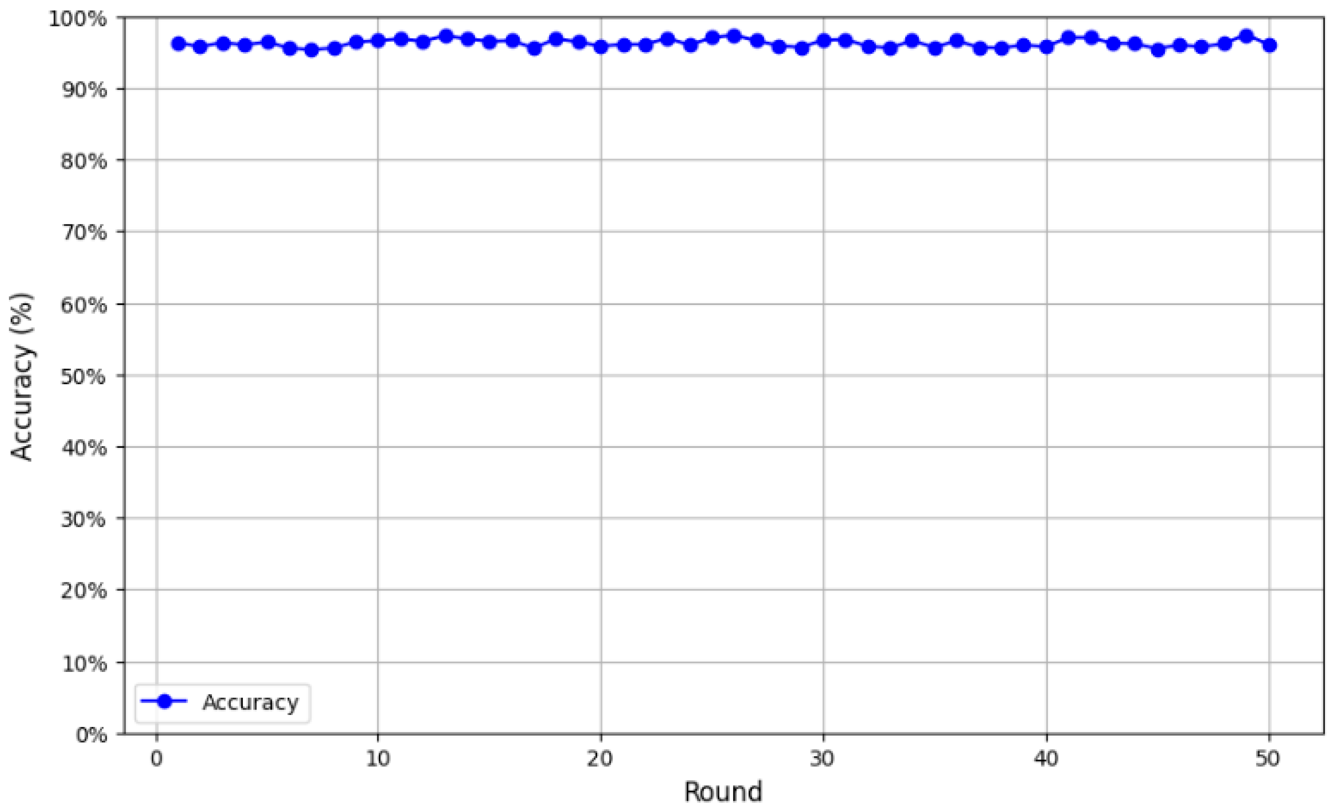 Figure 6, accuracy was monitored over 50 validation rounds, revealing a consistent upward trend. The model achieved an average accuracy of 95.27%, with performance peaking at 97.45% in the final round, confirming its robustness and efficiency.