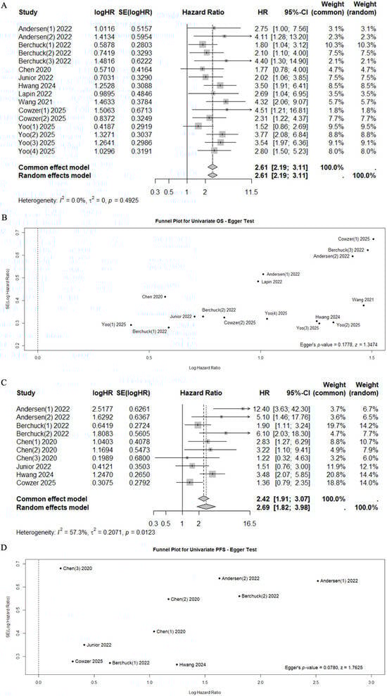 Forest plots for mortality risk (A) with funnel plot for publication bias [40,41,42,43,44,46,47,48,49] (B), and for progression risk (C) with funnel plot for publication bias [41,44,46,47,48,49] (D).