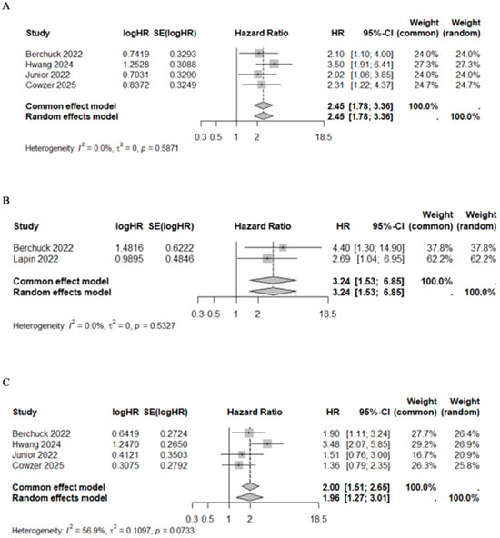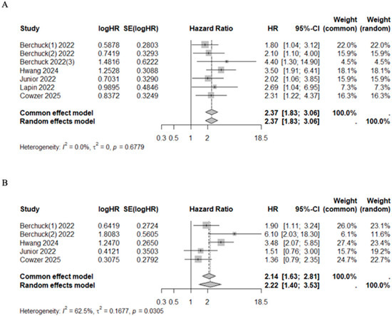 Patients with VAF+ had higher mortality and progression risk with a pooled HR of 2.37 (95%CI 1.83–3.06, I2 = 0.0%, p = 0.6779) and 2.22 (95%CI 1.40–3.53, I2 = 62.5%, p = 0.0305), respectively (Figure 4). Additionally, three studies classified patients into quartiles according to their maximum VAF value, reporting a median OS of 22.70 months (range 22.20–NR), 18.60 months (range 16.80–20.10), 14.10 months (range 9.30–18.30), and 9.00 months (range 7.00–11.80) for quartiles 1 through 4, respectively (Table 6) [44,48,49].