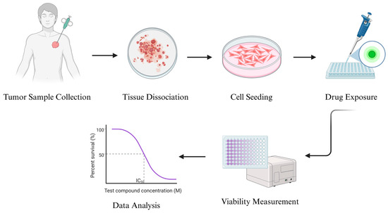The technical workflow typically begins with surgical or biopsy-derived tumor tissue, which is enzymatically digested to yield a single-cell suspension. Cells are seeded in two-dimensional (2D) culture formats, where they adhere and proliferate under optimized conditions. Once a stable monolayer is established, drug exposure is initiated across a range of concentrations. After 48–72 h of incubation, endpoint assays are performed to evaluate drug effects on tumor cell viability or survival. This process yields dose–response curves and IC50 values, which serve as surrogate markers of clinical sensitivity or resistance [54] (Figure 1).