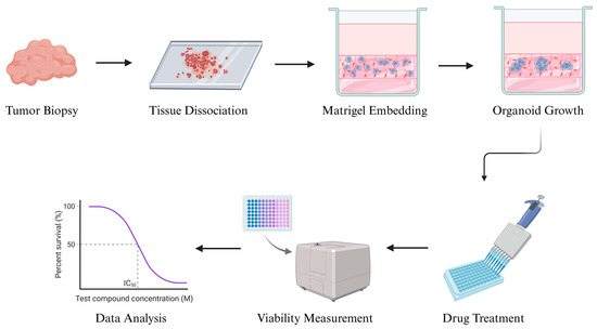 The concept of organoid culture was first developed in the early 2000s, initially in gastrointestinal and colorectal cancers, and later expanded to various solid tumors. The standard organoid culture process typically involves enzymatic and mechanical dissociation of fresh tumor tissue into small clusters or single cells, which are then embedded in an extracellular matrix scaffold such as Matrigel. The cells are grown in serum-free, growth factor-enriched media that support stem-like populations and promote tumor propagation. Over days to weeks, these cells proliferate and self-organize into 3D structures that preserve the original tumor’s histopathology and genomic features [61] (Figure 2).