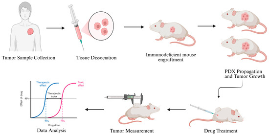 Once a PDX tumor is established, it can be serially passaged into additional mice, maintaining the histological, molecular, and phenotypic characteristics of the original patient tumor over multiple generations. This sustained propagation enables the development of PDX cohorts that can be used for functional drug testing. When tumors reach a predefined size, mice are randomized into control and treatment groups, and therapeutic agents—including chemotherapy, targeted therapies, or novel compounds—are administered according to dosing schedules designed to mimic clinical treatment protocols [81] (Figure 3).