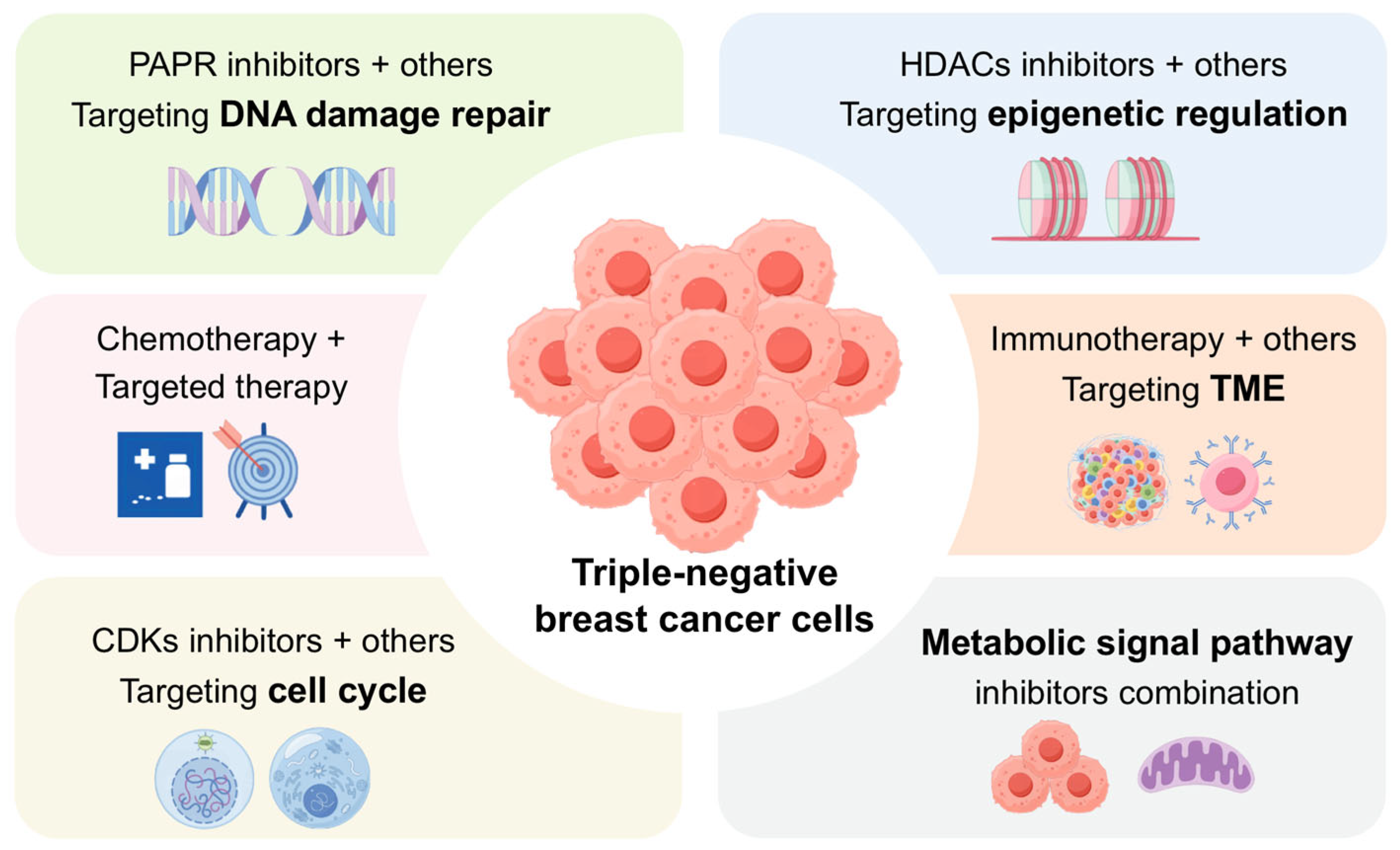 While dual-target strategies against classical pathways such as DDR, cell cycle regulation, epigenetic modification, PI3K/AKT/mTOR, MAPK, and PARP have shown potential in TNBC treatment, most remain in early-stage investigation. Given the high heterogeneity and complex drug resistance mechanisms of TNBC, there is an urgent need to develop more diversified combination therapies.