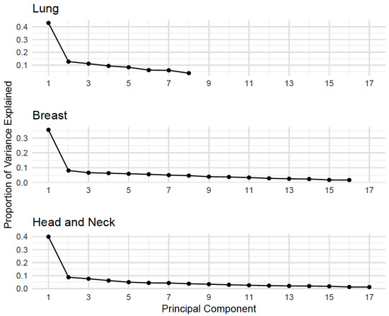 Scree Plots of Principal Components by Cohort: Lung, Breast, and Head and Neck Cancer. Note. Scree plots display the proportion of variance explained by each principal component for each cancer cohort. These plots help identify the number of components that capture the most variation in PRO-CTCAE responses across tumor types, supporting dimensionality reduction and informing subsequent analyses.