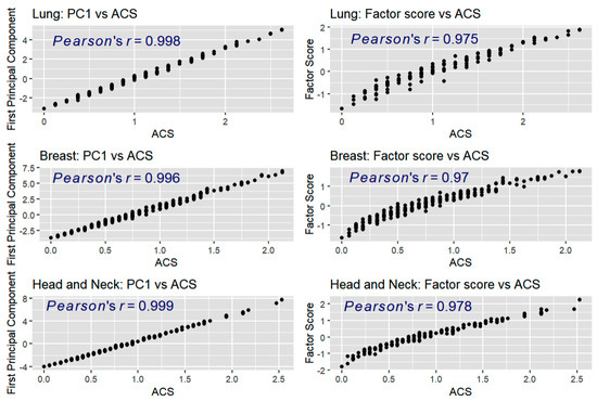 Scatter plots of composite averages vs. the scores derived from principal component analysis (PC1) and confirmatory factor analysis (CFA) across three cohorts. Note. Each cohort—Lung (top row), Breast (middle row), and Head and Neck (bottom row)—includes two plots: PC1 vs. ACS (left) and Factor score vs. ACS (right). High Pearson correlation coefficients (ranging from 0.97 to 0.999) indicate strong linear associations, supporting the validity of ACS as a summary indicator of symptomatic AE burden.