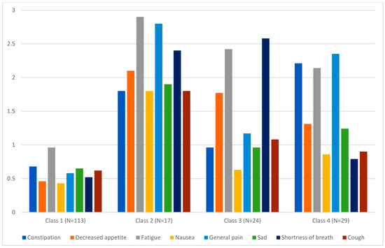 Symptomatic AE profiles across four latent classes in the lung cohort (N = 183). Note. Four distinct symptomatic AE profiles were observed in the lung cohort. Each latent profile was characterized by a distinct symptom expression pattern. Class-specific mean AE-level composite scores (range 0–3) are depicted on the Y axis. While all classes exhibited a distinct symptomatic AE profile, only latent classes 1 and 2 (high on all symptoms versus low on all symptoms) demonstrated significantly different mean ACS scores. The mean ACS scores for classes 3 and 4 were nearly identical, yet the profiles themselves were qualitatively distinct. Individuals in latent class 3 were experiencing significant appetite loss, fatigue and shortness of breath, whereas those in latent class 4 were experiencing significant constipation, fatigue and pain. The mean (SD) of ACS was 0.6 (0.3) in class 1 (low on all symptoms), 2.1 (0.3) in class 2 (high on all symptoms), 1.4 (0.3) in class 3 (elevated appetite loss, fatigue, and shortness of breath), and 1.5 (0.2) in class 4 (elevated constipation, fatigue, and pain).