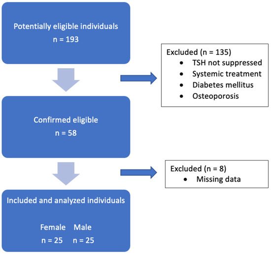 - Karner, I.; Hrgović, Z.; Sijanović, S.; Buković, D.; Klobucar, A.; Usadel, K.H.; Fassbender, W.J. Bone mineral density changes and bone turnover in thyroid carcinoma patients treated with supraphysiologic doses of thyroxine. Eur. J. Med. Res. 2005, 10, 480–488. [Google Scholar] [PubMed]