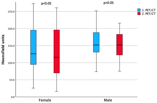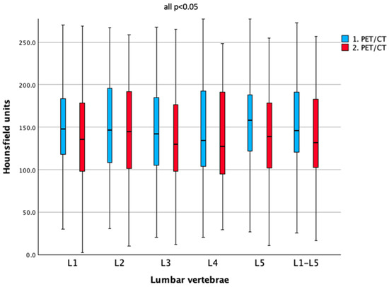 | Lumbar Vertebrae | Bone Density (HU $)—1. PET/CT | Bone Density (HU $)—2. PET/CT | Bone Density (HU $)—1. PET/CT | Bone Density (HU $)—2. PET/CT |