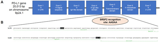 23]. Due to the aforementioned special relevance of PD-L1 in antibody-based anti-tumor immunotherapies, particularly its presence as a membrane-bound or secreted protein, the PD-L1 sequence was analyzed for the presence of SRSF2 recognition sites. It was found that a corresponding binding site for this splicing factor is located directly at the end of exon 5 (transmembrane domain) and intron 5 (