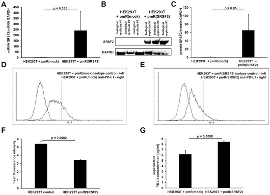 To test a possible association for the splicing of the full-length PD-L1 mRNA to the shorter secreted splice variant, an SRSF2 overexpression vector was first cloned. To validate the functionality of this SRSF2 overexpression vector, HEK293T cells were transiently transfected with this SRSF2 overexpression vector and with the vector control. After 72 h, the transfectants were characterized for SRSF2 overexpression at the transcript and protein levels. A statistically significant (
