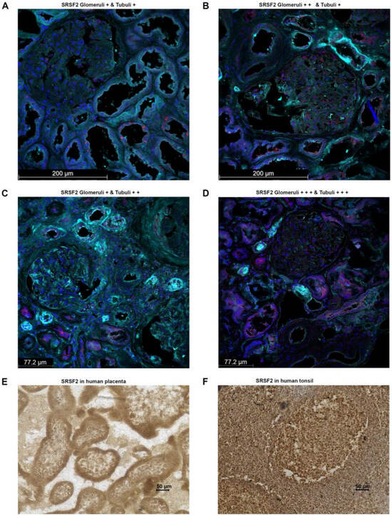 Confocal images were acquired at RT using sequential scanning mode to avoid spectral overlap (Leica Stellaris 5 DMI8 microscope equipped with Diode 405 and WLL lasers; LAS AF software, v2.6.0, build 7266; Leica Microsystems CMS GmbH, Wetzlar, Germany; objective: HCX PL APO CS 40×/1.25 OIL UV, Leica DMI6000B). Device-specific software was used to adjust signal intensities, generate z-stack images, and create maximum intensity projections (MIPs). For all samples, identical acquisition parameters (laser power, detector gain, and offset settings) were applied to ensure comparability of SRSF2 signal intensities across tissue specimens. Renal tissue images representing the distinct cortical regions were independently reviewed by the authors.