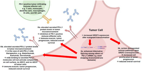 The altered ratio of membrane-bound to secreted PD-L1 could play a decisive role in the reduced overall survival observed in many tumor diseases with elevated SRSF2 expression—regardless of whether a therapy with mAbs against the PD-1/PD-L1 ICP axis is applied, because it also involves the inhibition of tumor-infiltrating immune effector cells. Furthermore, an increased concentration of secreted PD-L1 in the tumor microenvironment could inhibit immune effectors efficiently even before they reach the tumor cells. These relationships are summarized in a schematic overview (