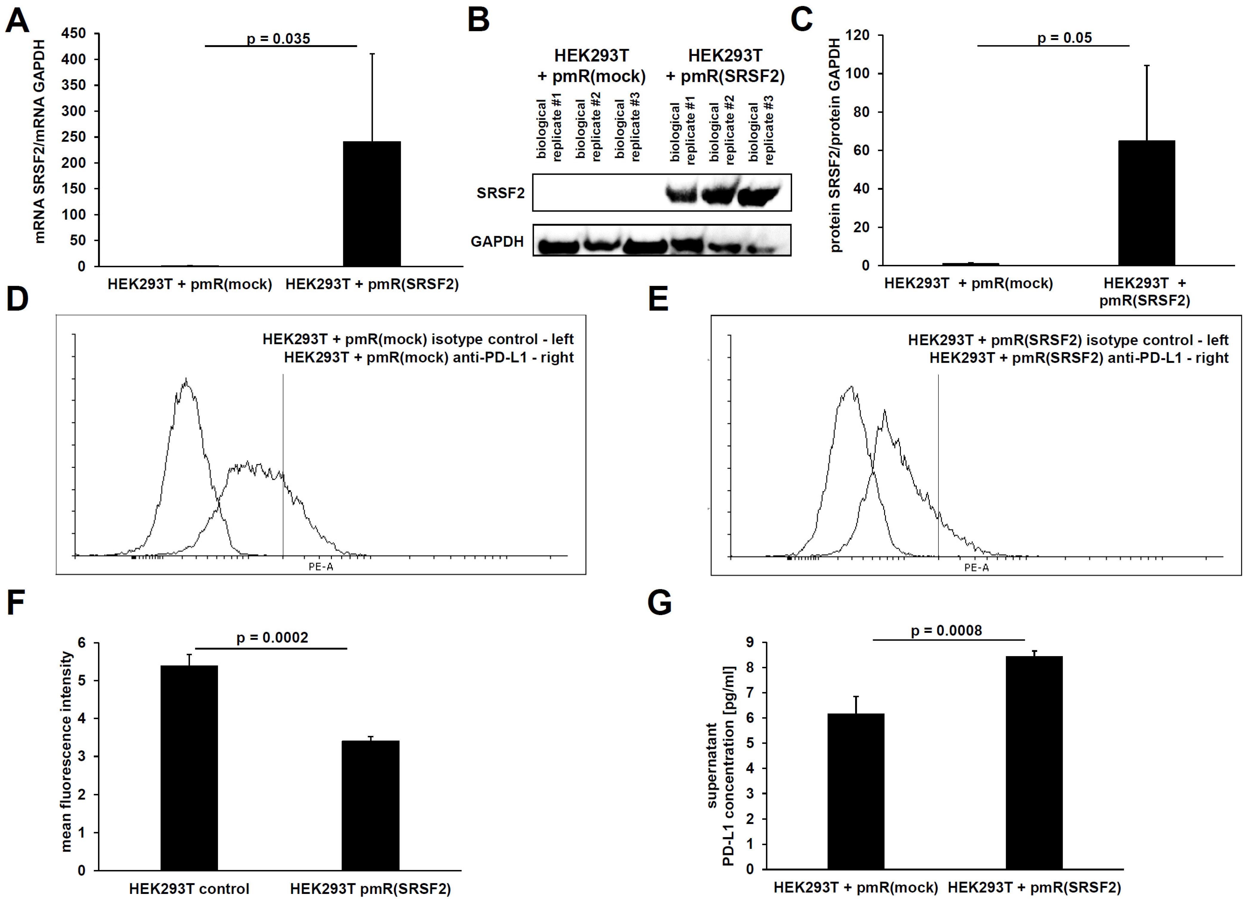 p = 0.0002) decrease in the membrane-bound PD-L1 protein as a direct consequence of overexpression of the splice factor SRSF2. This can be seen in the two representative overlays (