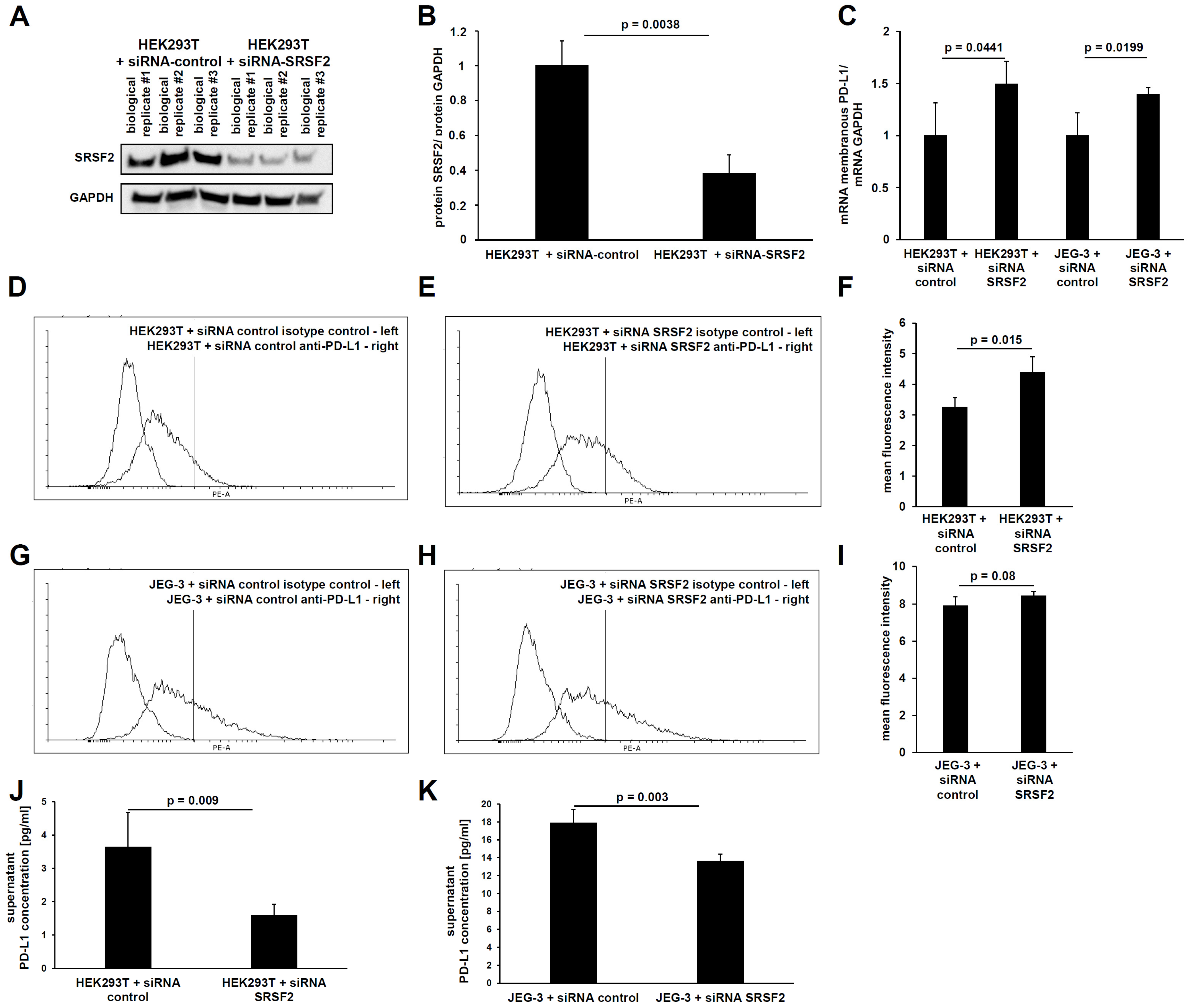 9], were used. This showed that both the HEK293T and JEG-3 transfectants still retained a statistically significant increase in the membranous full-length PD-L1 transcript due to siRNA-mediated SRSF2 downregulation (