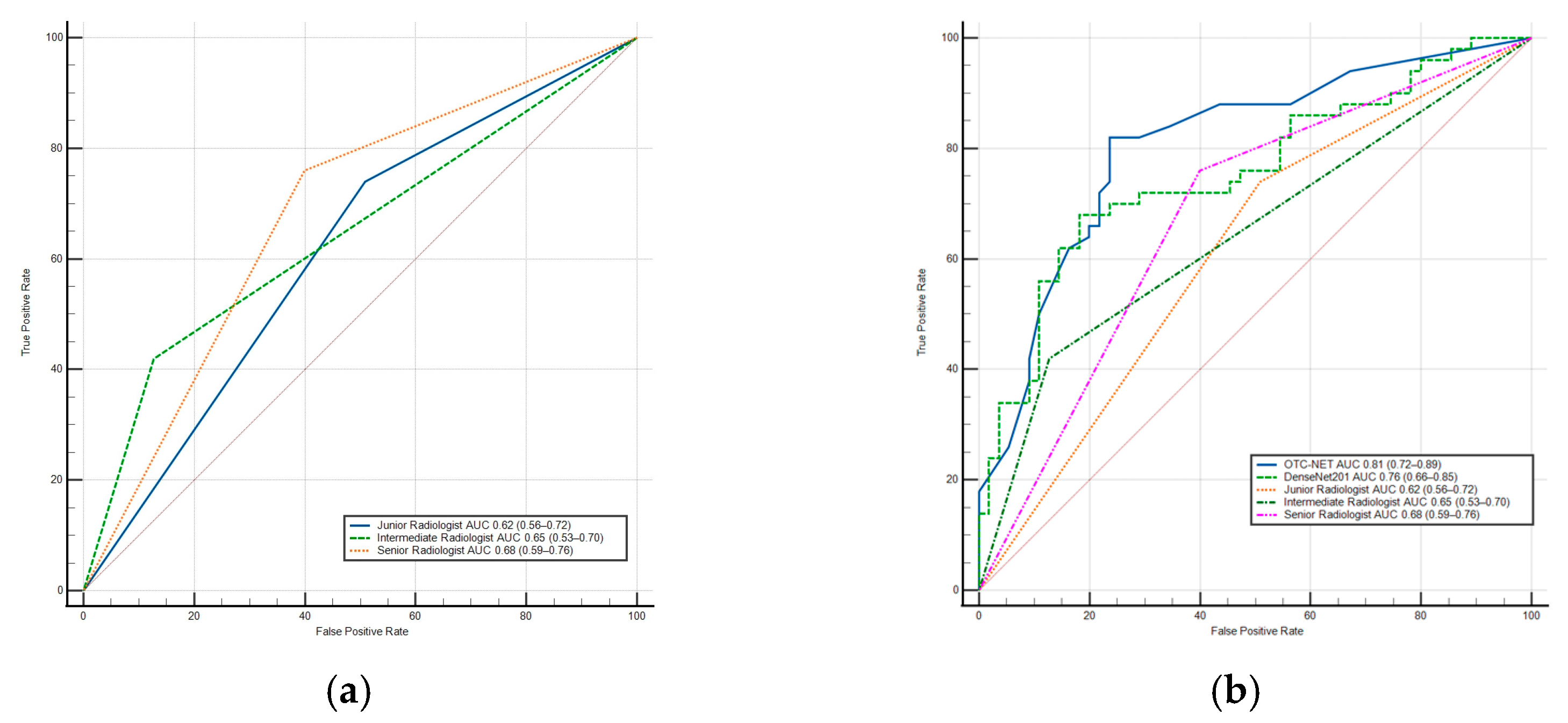 3.4. Comparison of OTC-NET, DenseNet201, and Radiologists