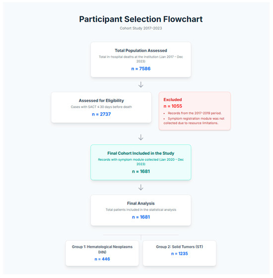 Flow chart shows the participant selection process of study cohort. Note: The cohort selected for this study consists entirely of patients who have information from the new module of symptomatic variables related to palliative care actions. It corresponds to the period 2020–2023. The excluded cases do not have the information and correspond to the oldest period in the database (2017–2019). To find out if there are differences between the periods of the database with or without symptom registration data, see Supplementary Materials (Table S1), which shows that there are no significant differences in patient characteristics between the two.