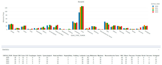 Distribution of tumor pathologies over the years. Note: Distribution of tumor types registered in the MS database. The largest number of cases is lung cancer (28.5%).