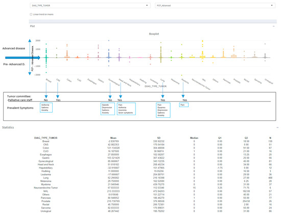 The different periods in which palliative care (PC) operates based on the definition of advanced disease (AD) according to tumor type (excluded cases with follow-up charge, greater than 2000 days). Legend: SD: standard deviation; Q1: first quartile or 25th percentile; Q3: third quartile or 75th percentile; N: number of available values. Note: In the graph, the negative ranges imply that the PC consultations were before the AD definition, we have called them “pre-advanced” visits. On the lowest line, information about the presence or absence of a palliative specialist in the tumor committees (negative for gynecological cancer and breast cancer). In the red boxes, note what type of symptoms are most frequently recorded in “pre-advanced” cases.