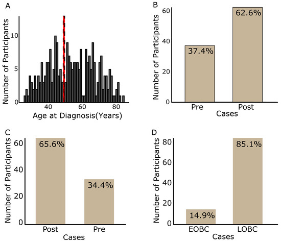 Participants’ case classification. The age range of all participants recruited (A), the proportion of premenopausal and postmenopausal using 50 years (B) and 48 years (C), and EOBC and LOBC (D) case groups. Participants’ age ranged from 27 to 83 years; the peak age at diagnosis (red dashed peaks) was 50 years (A). Approximately 34.4% of the cases were premenopausal breast cancer (B) and 14.9% were EOBC (C). Pre—premenopausal breast cancer; Post—postmenopausal breast cancer; EOBC—early-onset breast cancer; LOBC—late-onset breast cancer.