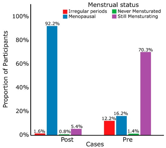 Menstrual status of participants. About 5.4% of the participants diagnosed at 48 years and older were still menstruating and 16.2% of those diagnosed below 48 years were menopausal. Two participants had never menstruated. Post—postmenopausal; Pre—premenopausal.