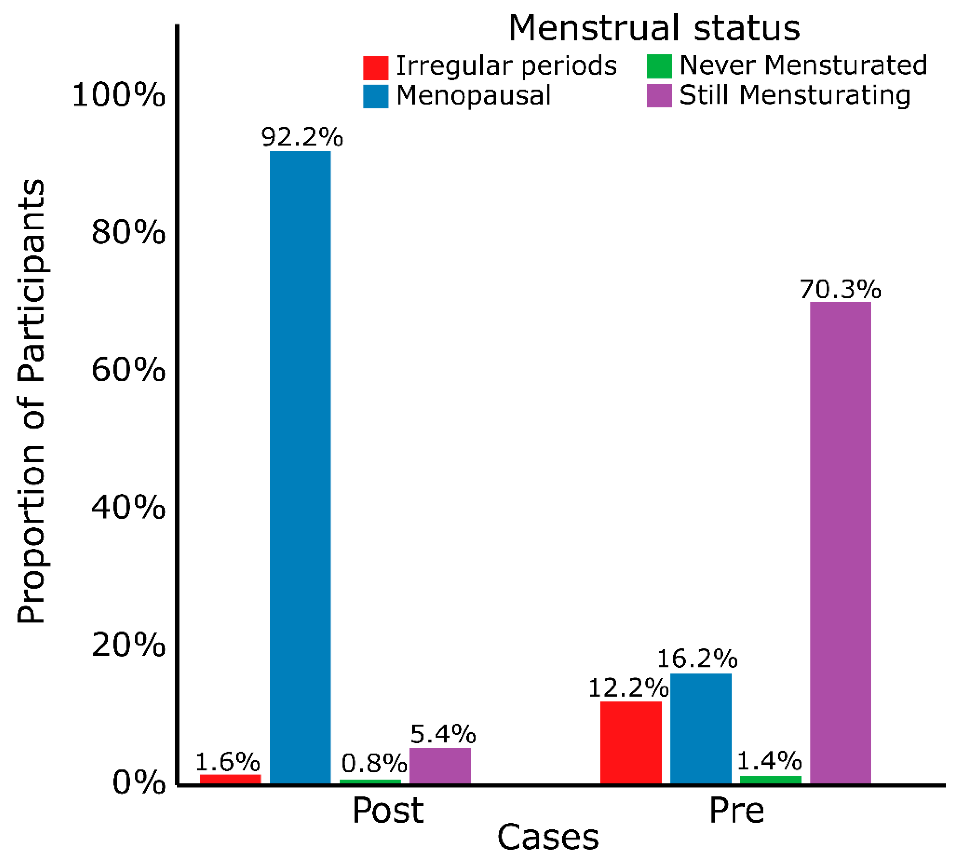 | Reproductive Factors | N | Overall N = 262 1 | Post N = 172 1 | Pre N = 90 1 | p-Value 2 | EOBC N = 39 1 | LOBC N = 223 1 | p-Value 2 |