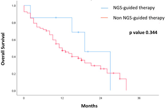 On unadjusted Kaplan–Meier analysis, overall survival (OS) was numerically longer in patients who received NGS-guided therapy than in those who did not; however, the difference was not statistically significant (log-rank p = 0.344) (Figure 2).