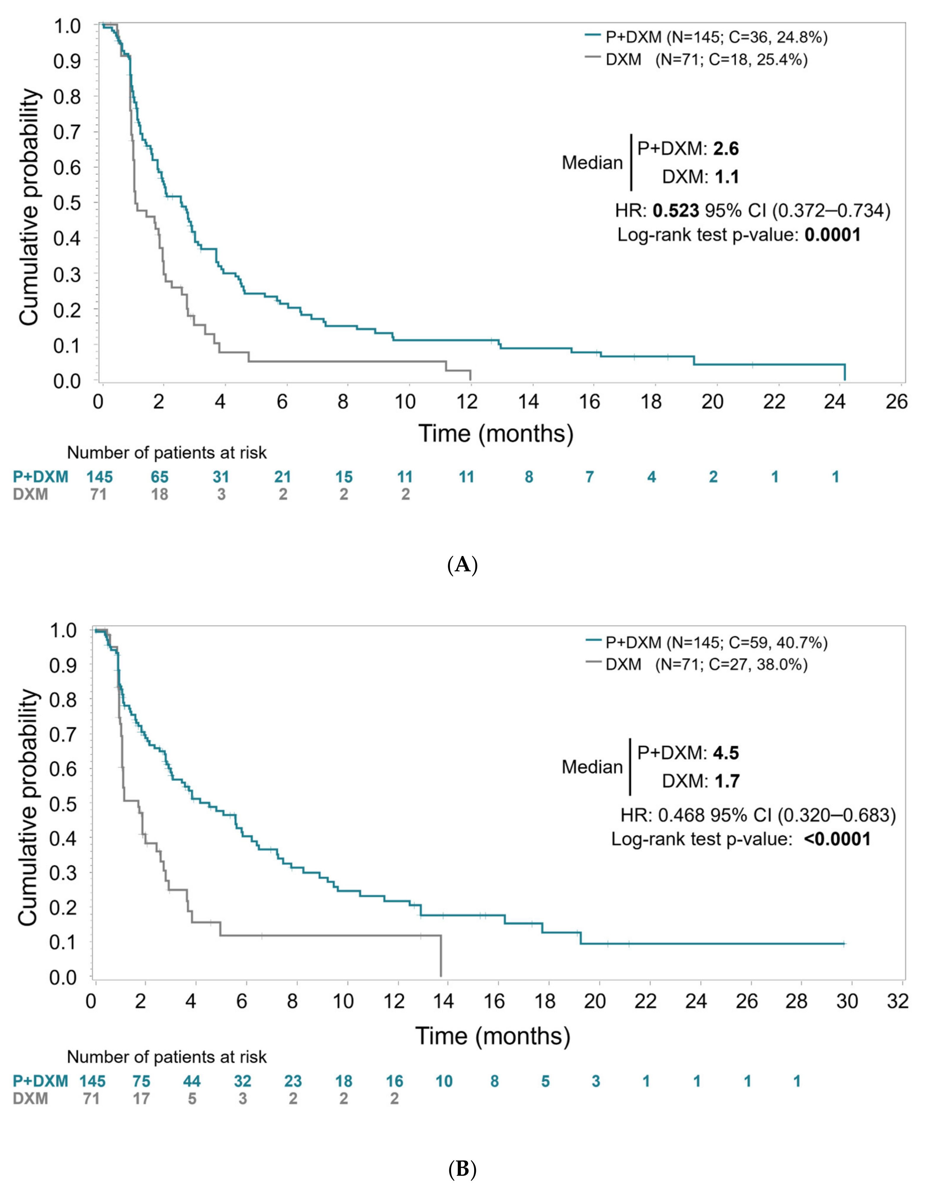 PFS analysis requiring PD confirmation by investigator’s assessment (a planned sensitivity analysis) showed median PFS of 4.5 months (95% CI, 3.0–5.8 months) in Arm A (plitidepsin plus DXM) and 1.7 months (95% CI, 1.1–2.4 months) in Arm B (DXM) (log-rank p < 0.0001), with a relative risk of progression or death reduced by 53.2% in patients treated with plitidepsin plus DXM (HR = 0.468, 95%CI, 0.320–0.683; p < 0.0001).