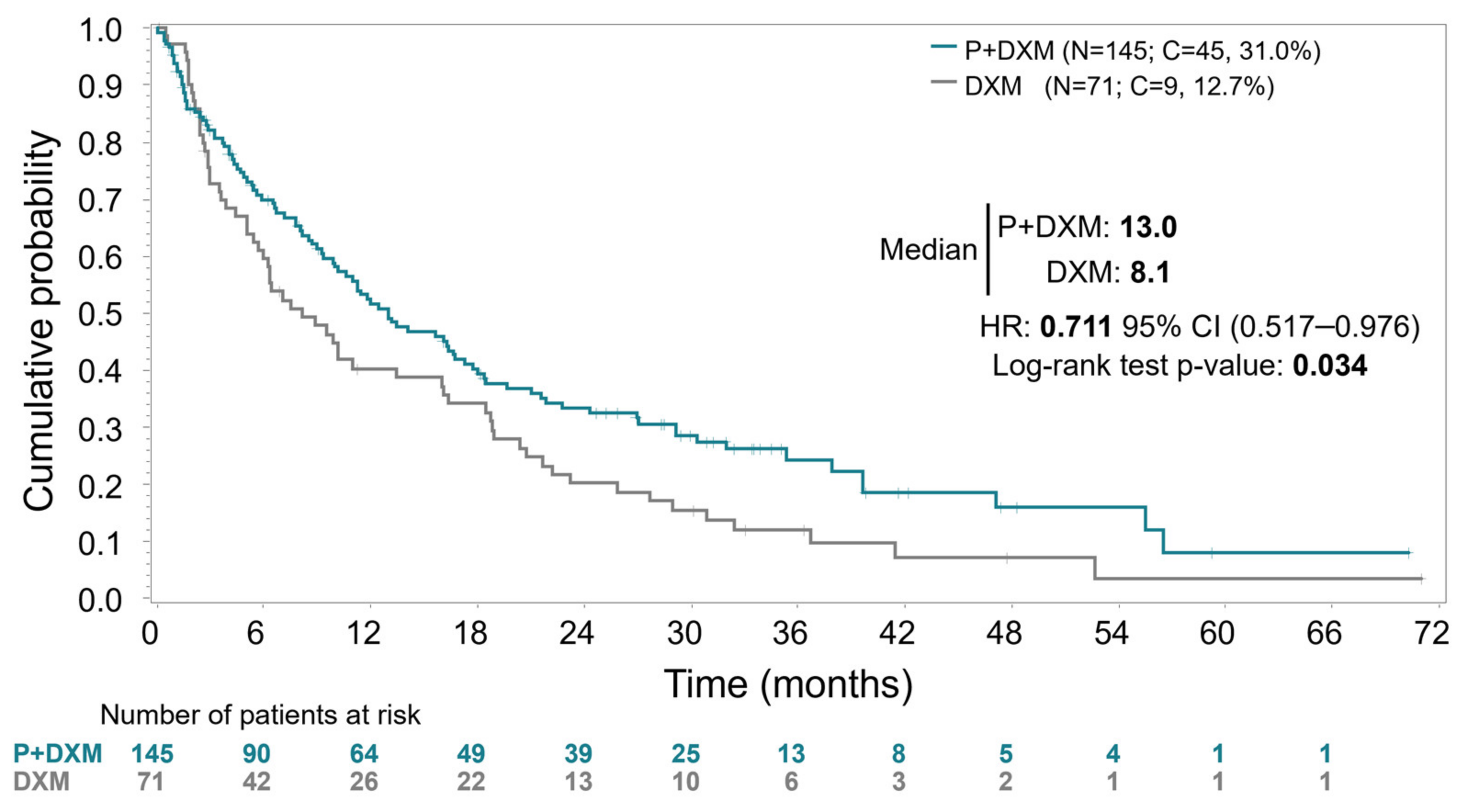 Figure 2). Despite the crossover in the control arm to the experimental arm of 31 patients (43.7%), the relative risk of death was reduced by 28.9% in patients treated with plitidepsin plus DXM (HR = 0.711, 95%CI, 0.517–0.976;