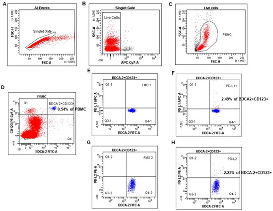 The identification of the plasmacytoid dendritic cell population in peripheral blood mononuclear cells (PBMC). PBMC were stained and acquired using FACS. pDCs were identified with the following gating strategy. (A) A combination of forward scatter area (FSC-A) and forward scatter height (FSC-H) was utilized to exclude doublets. (B) After gating for singlets, live cells were selected. (C) Next, mononuclear cells were selected based on their side-scatter/forward-scatter (SSC/FSC) properties. (D) Gate on the BDCA-2+CD123+ (positive) cell population in BDCA-2 FITC vs. CD123 PE-Cy7 dot plot. (E–H) Selected BDCA-2+CD123+ cells were analyzed for PD-L1 and PD-L2 expression. The final dot plot (F) indicates cells BDCA-2+CD123+PD-L1+ (PD-L1+ pDCs). The final dot plot (H) indicates cells BDCA-2+CD123+PD-L2+(PD-L2+ pDCs). The plot (E) is an FMO control for PD-L1 (FMO1), stained with all markers in the panel, except for PD-L1. The plot (G) is an FMO control for PD-L2 (FMO2), stained with all markers in the panel, except for PD-L2. Legend: red indicates PB mononuclear cells, and blue indicates %pDCs (BDCA-2+CD123+).