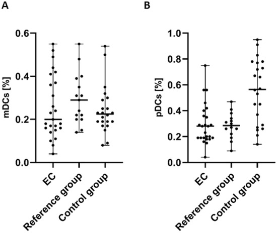 Percentage of mDCs (BDCA-1+CD19− cells) (A) and pDCs (BDCA-2+CD123+ cells) (B) in PBMCs of EC patients (n = 25), the reference group (n = 15), and the control group (n = 22). Differences between groups were analyzed using the Mann–Whitney U test. Data are presented as median (range).