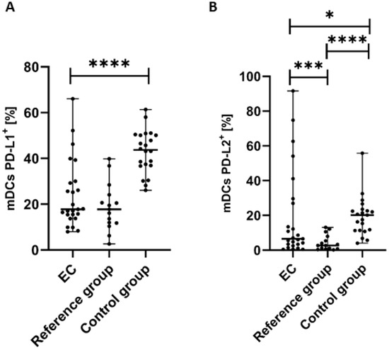 Percentage of BDCA-1+CD19− cells with PD-L1+ (A) and PD-L2+ (B) in EC patients (n = 25), the reference group (n = 15), and the control group (n = 22). Differences between groups were analyzed using the Mann–Whitney U test. Data are presented as median (range), and statistically significant differences are indicated as: * p < 0.05, *** p < 0.001, **** p < 0.0001.