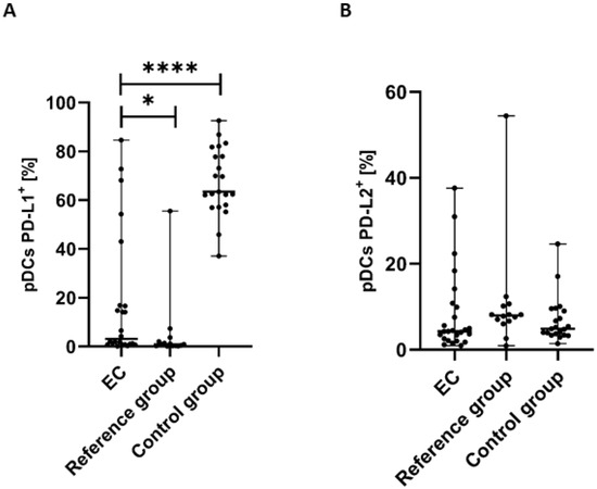 Percentage of BDCA-2+CD123+ cells with PD-L1+ (A) and PD-L2+ (B) in EC patients (n = 24), the reference group (n = 14), and the control group (n = 21). Differences between groups were analyzed using the Mann–Whitney U test. Data are presented as median (range), and statistically significant differences are indicated as: * p < 0.05, **** p < 0.0001.