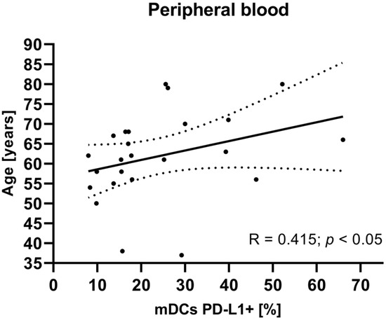 One of the aims of our study was to investigate the relationships between mDCs, pDCs, and MO expressing PD-L1 and PD-L2, the plasma levels of sPD-1, sPD-L2 and sPD-L2, as well as the gene expression levels of PD-L1 and PD-L2 in tissue, with the clinical features of patients with endometrial cancer. Interestingly, our results revealed significant correlations between the percentage of PD-L1-positive mDCs and the age of EC patients. Similarly, the plasma sPD-1 levels significantly correlated with the age of EC patients studied, which is consistent with previous findings reporting an association between sPD-1 levels and patients’ age [20]. However, this issue requires further investigation. A similar relationship was demonstrated by Wahba et al. [41]. In their study using IHC, they demonstrated a correlation between older patients’ age and positive PD-L1 expression in both tumor and tumor-infiltrating cells, although these results are not clearly confirmed in the literature. Considering advanced age (55–60 years), which is one of the most significant risk factors for the development of EC, the observed correlations may reflect age-related changes in the immune response. Additionally, they may indicate the effects of prolonged exposure to estrogens, which may influence the tumor microenvironment and promote its progression, thus confirming that age is a significant prognostic factor in EC [17,36,42].