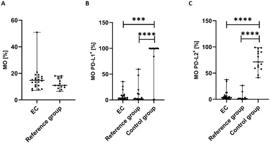 Percentage of CD45+CD14+ cells (A) in EC patients (n = 22) and the reference group (n = 15). Percentage of CD45+CD14+ cells with PD-L1 (B) and PD-L2 expression (C) in peripheral blood of EC patients, the reference group, and the control group (n = 15). Differences between groups were analyzed using the Mann–Whitney U test. Data are presented as median (range), and statistically significant differences are indicated as: *** p < 0.001, **** p < 0.0001.