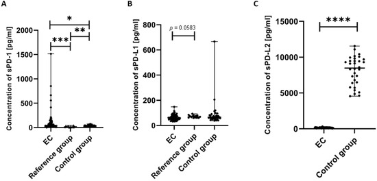 We next analyzed the concentration of the soluble forms of PD-1, sPD-L1, and sPD-L2 in plasma samples obtained from the study participants. We detected that the concentration of sPD-1 in the plasma of EC patients was significantly higher compared to the control group (p < 0.05) and the reference group (p < 0.001). We also observed that the level of sPD-1 in the plasma of the reference group was significantly higher than in the control group (p < 0.01) (Figure 7A).