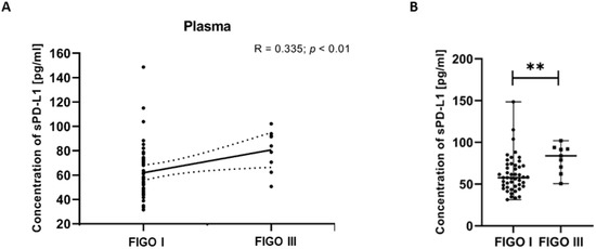 To investigate associations between clinical variables and immune parameters, we examined the relationships between FIGO stages of EC patients and plasma levels of sPD-L1. The analysis revealed a positive correlation between the sPD-L1 level in the plasma and the FIGO stages in EC patients (R Spearman: 0.335; t(N-2) 2.588; p < 0.01) (Figure 8A). We detected that the plasma sPD-L1 concentration in EC patients with FIGO stage III was significantly higher than in those with FIGO stage I (p < 0.01) (Figure 8B).