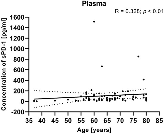 We also calculated the relationship between the clinical data of EC patients (such as age, BMI, FIGO stage, and tumor grade) and the plasma levels of sPD-1. There was no significant correlation between the plasma concentrations of sPD-1 and clinical parameters (including FIGO stage, BMI, tumor grade). However, the analysis showed that a positive relationship between the sPD-1 level in the plasma and the age of EC patients (R Spearman: 0.328; t(N-2) 2.823; p < 0.01) (Figure 9).