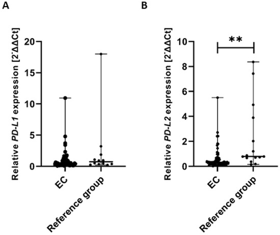 Comparison of PD-L1 (A) and PD-L2 (B) gene expression levels in tissue samples between EC patients (n = 61) and the reference group (n = 15). Differences between groups were analyzed using the Mann–Whitney U test. Data are presented as median (range), and statistically significant differences are indicated as: ** p < 0.01.