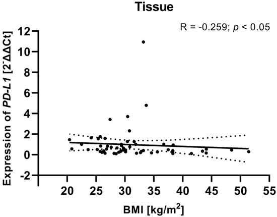 To investigate potential associations between clinical variables and gene expression, we examined the relationship between the clinical parameters (including FIGO stage, tumor grade, age, and BMI) of EC patients and PD-L1/PD-L2 gene expression levels in tissue samples from EC patients. Analysis showed that a weak negative relationship between the BMI of EC patients and PD-L1 gene expression level in tissue samples (R Spearman: −0.259; t(N-2) −2.01; p < 0.05) (Figure 11). Although the correlation was weak, the negative association may suggest that higher BMI is linked to lower PD-L1 gene expression in EC tissues. The analysis revealed no statistically significant correlations for PD-L2 or for the other clinical parameters. The lack of relationships between PD-L2 expression and clinical parameters may indicate that PD-L2 functions independently of these clinical features or is regulated by other mechanisms within the TME.