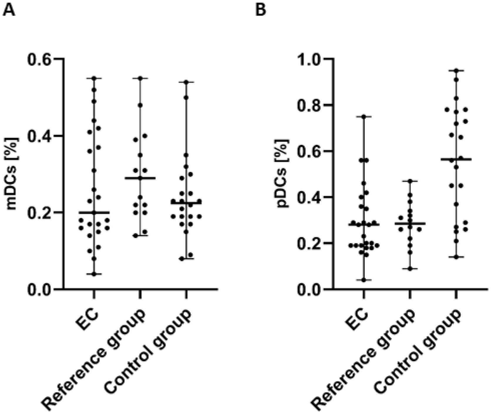 3.1. Percentage of Myeloid (BDCA-1+CD19−) and Plasmacytoid (BDCA-2+CD123+) Dendritic Cells Within PBMCs of EC Patients