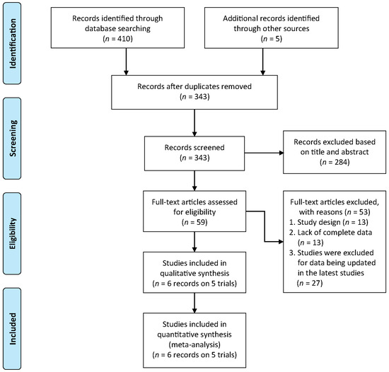 The systematic literature search and selection process are summarized in Figure 1. Of the 415 initially identified records, 6 articles (reporting on 5 RCTs) met the eligibility criteria and were included in the meta-analysis after a systematic screening process [16,18,19,20,21,29], which excluded records primarily for outdated data, incompatible study design, or insufficient reporting. These 5 RCTs encompassed a total of 2017 patients. Among these, three trials focused on NDMM patients (n = 1408), and two enrolled RRMM patients (n = 609). The regimens included are isatuximab combined with pomalidomide-dexamethasone (Isa-Pd), carfilzomib-dexamethasone (Isa-Kd), lenalidomide-dexamethasone (Isa-Rd), and bortezomib-based triplets. The median follow-up duration ranged from 20 to 60 months across studies. The baseline characteristics of the included studies are summarized in Table 1.