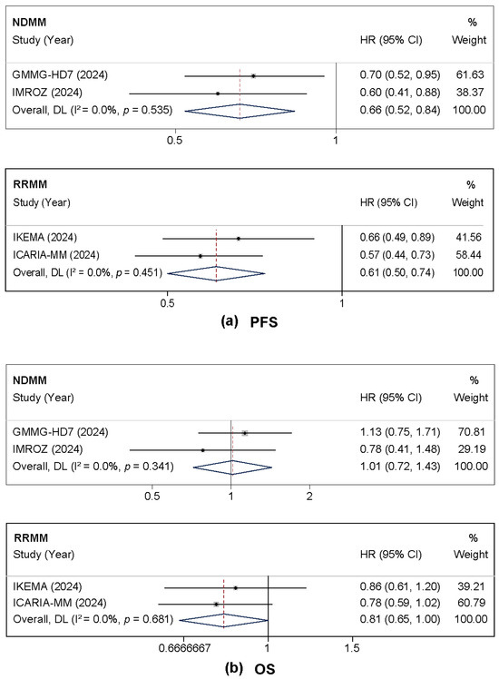Forest plots of hazard ratios (HRs) comparing isatuximab-based regimens to control. All analyses used the random-effects model. (a) Progression-free survival (PFS). (b) Overall survival (OS). For each outcome, the forest plot for patients with newly diagnosed multiple myeloma (NDMM) is shown above the plot for those with relapsed/refractory disease (RRMM) [16,18,20,21].