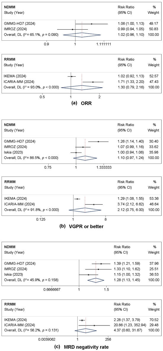 Forest plots of risk ratios (RRs) comparing isatuximab-based regimens to control. All analyses used the random-effects model. (a) Overall response rate (ORR). (b) Very good partial response (VGPR) or better. (c) Minimal residual disease (MRD) negativity rate. For each outcome, the forest plot for patients with newly diagnosed multiple myeloma (NDMM) is shown above the plot for those with relapsed/refractory disease (RRMM) [16,18,19,20,21,29].