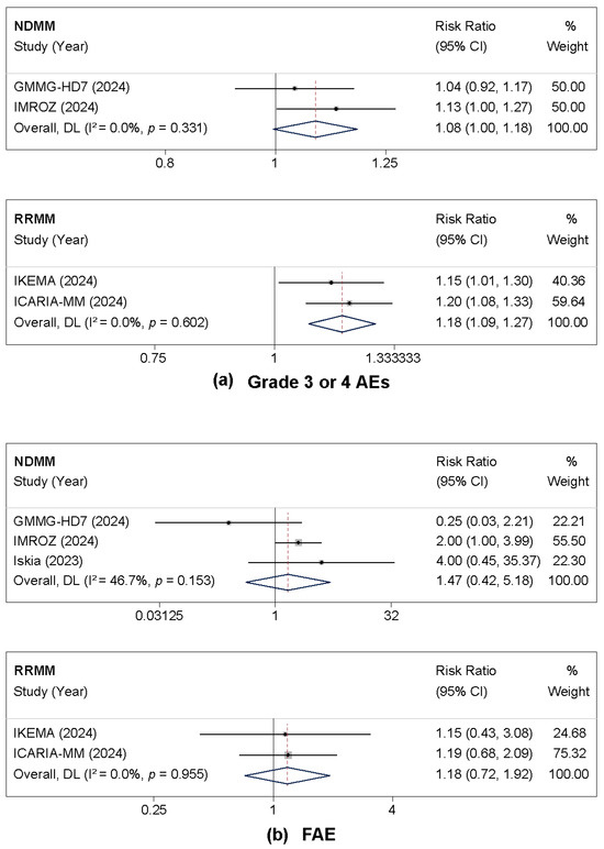 Forest plots of risk ratios (RRs) comparing isatuximab-based regimens to control for grade ≥ 3 adverse events. All analyses used the random-effects model. (a) Grade 3 or 4 adverse events. (b) Fatal adverse event (FAE). For each outcome, the forest plot for patients with newly diagnosed multiple myeloma (NDMM) is shown above the plot for those with relapsed/refractory disease (RRMM) [16,18,19,20,21,29].