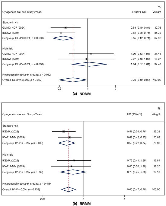 Forest plots of hazard ratios (HRs) for progression-free survival (PFS) from subgroup analysis by cytogenetic risk and disease status comparing isatuximab-based regimens to the control arm. (a) Newly diagnosed multiple myeloma (NDMM). (b) Relapsed/refractory multiple myeloma (RRMM). The random-effects model was used [16,18,20,21].