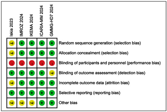 All trials demonstrated low risk of bias concerning random sequence generation and allocation concealment, ensuring the reliability of the randomization process. The primary concern across all studies was performance bias due to their open-label nature. However, this was substantially mitigated for the primary efficacy endpoints in four of the five trials (IKEMA, ICARIA-MM, IMROZ, and IsKia) through the use of blinded Independent Review Committees or central laboratory assessments, thus reducing detection bias. While the heterogeneity in patient populations (newly diagnosed versus relapsed/refractory) and specific treatment regimens exists, the consistent demonstration of a significant PFS benefit and deeper responses with isatuximab across these well-conducted trials strengthens the validity and generalizability of the collective findings. Consequently, despite the open-label design, the results are considered reliable for informing clinical practice (Figure 6).