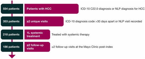 Patients with uHCC (18 to 90 years of age) from the Mayo Clinic sites who received a 1L systemic therapy between June 2020 and October 2022, with at least two follow-up visits, were included in the analysis. HCC diagnosis was captured using International Classification of Diseases criteria 9th edition (ICD-9) codes 155.0 and 155.2, 10th edition (ICD-10) codes C22.0, C22.8, and C22.9, or using natural language processing models. Unresectability was based on the surgeon’s assessment of specific criteria, including status of infiltrative disease, Barcelona Clinic Liver Cancer (BCLC) C staging, and comorbidities limiting resection. Patients were required to have at least two follow-up visits to observe continuity of care and to allow assessment of post-index events.