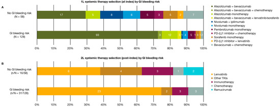 For patients with risk of GI bleeding, 112/128 (87.5%) patients received a 1L therapy that contained atezolizumab, in which 93 patients received atezolizumab plus bevacizumab, 12 received atezolizumab monotherapy, and 7 received other atezolizumab-containing combination therapies. For patients without risk of GI bleeding, 22/58 (37.9%) patients received a 1L therapy containing atezolizumab, in which 17 patients received atezolizumab plus bevacizumab and five patients received atezolizumab monotherapy. In total, 16/58 (27.6%) patients without GI bleeding risk and 31/128 (24.2%) patients with GI bleeding risk received a 2L systemic therapy, of which lenvatinib was the most common 2L systemic therapy for patients in both groups (Figure 2B).