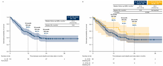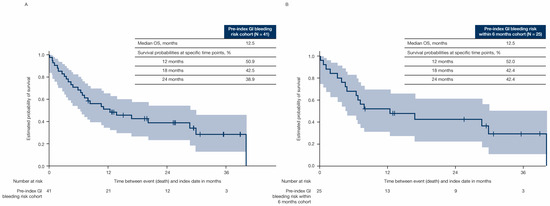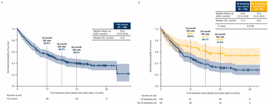 Median follow-up (interquartile range) was 20.6 (12.9–26.9) months in all patients, 20.9 (12.3–25.8) months in patients with GI bleeding risk, and 20.4 (14.3–28.2) months in patients without GI bleeding risk (Figure 3). Median OS (95% confidence interval [CI]) was 14.4 (10.1–19.4) months in all patients (Figure 3A), and was shorter in patients with GI bleeding risk (11.4 [7.8–14.8] months) versus patients without GI bleeding risk (40.3 [not calculable] months) (Figure 3B). The OS rates for patients treated with any systemic therapy with and without GI bleeding risk were 48.9% and 68.9% at 12 months, 38.1% and 61.1% at 18 months, and 31.8% and 56.8% at 24 months, respectively (Figure 3B). Median OS for patients with pre-index GI bleeding risk (n = 41) and patients with pre-index GI bleeding risk within 6 months of the pre-index date (n = 25) was 12.5 months (Figure 4).
