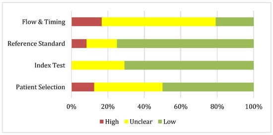 Risk of bias summary about each QUADAS-AI domain presented as percentages across the 24 included studies.